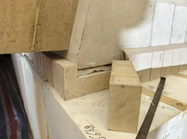 别看这只是一块小小的楔形砖,却构建起“挂钩砖—楔形砖—7字砖—池壁砖”四层协同防护体系。即便7字砖头部发生烧损,楔形砖依然能独立阻挡炉火,避免托板铁直接受冲刷,从根本上限制了7字砖的位移和脱落风险。这一动态密封安装工艺,既解决了预留间隙过大无法密封的问题,又避免了热膨胀导致的砖体挤压断裂,实现“小改动解决大问题”。